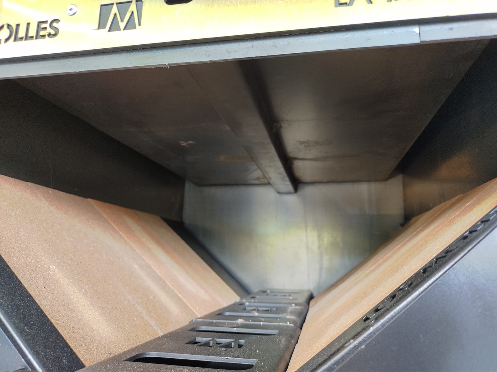 Su estructura cuenta con una cámara de combustión de chapa ciega que evita cualquier cambio que pueda sufrir durante su instalación. También incluye un sistema de apertura vertical con tope a 90º e incorpora un sistema de regulación de entrada de aire dentro de la cámara de cocción para que haga circular el calor o baje la temperatura y también en la combustión para poder controlar la combustión y la llama.